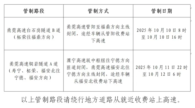 关于甬莞高速白石岗隧道、铜岩隧道 实施封闭施工交通管制的通告 为确保甬莞高速白石岗隧道、铜岩隧道风机更换施工有序进行,根据《中华人民共和国道路交通安全法》第三十九条和《中华人民共和国道路交通安全法实施条例》第三十五条等法律规定,需对上述路段进行封闭施工,具体交通管制如下: 一、管制时间、地点及绕行方案 二、行车提示 施工期间,上述路段受交通管制影响通行能力有限,请广大驾驶人尽量避开上述易拥堵路段,严格按照施工现场的交通标志和提示信息通行,服从现场人员指挥,因天气等原因需要对施工时间进行临时调整的,将通过沿线情报板及宁德高速交警微信公众号等对外发布。请社会各界和广大群众给予支持配合,自觉遵守交通秩序,确保通行安全。 施工期间给您带来的不便敬请谅解! 特此通告。 宁德高速交警支队 福建省高速公路集团有限公司 宁德管理分公司 2025年10月3日