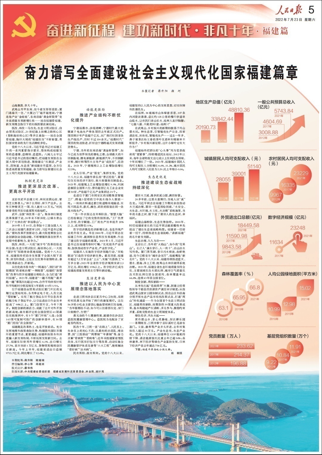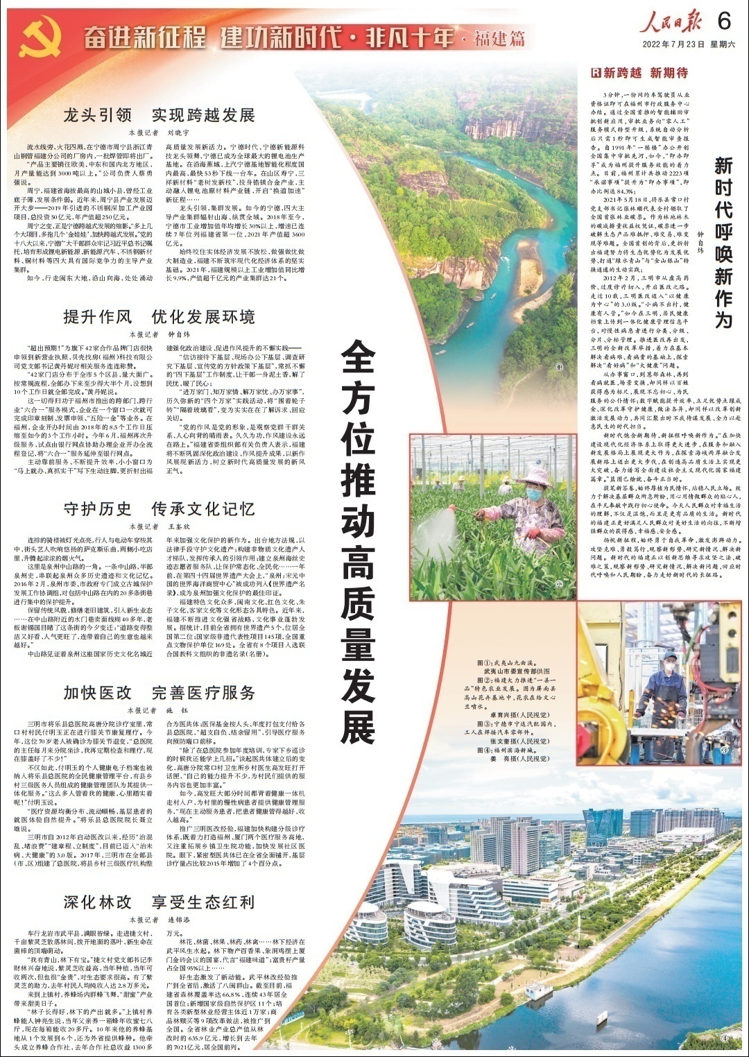 7月23日,《人民日报》刊发“奋进新征程 建功新时代·非凡十年”福建篇,以特刊2个整版的形式,聚焦党的十八大以来,八闽儿女牢记习近平总书记的殷切嘱托,把福建发展放在全国大局中谋划推进,全方位推进高质量发展超越,奋力谱写全面建设社会主义现代化国家福建篇章。