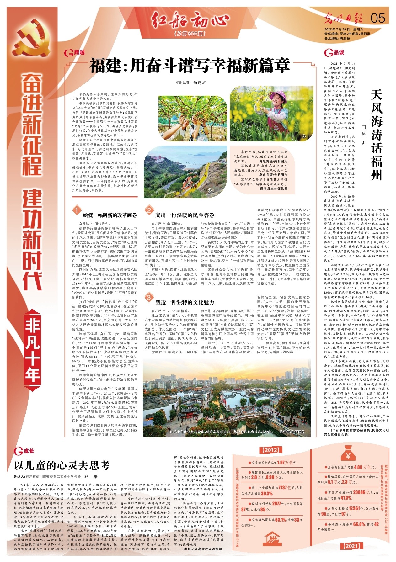 7月23日,光明日报整版刊发《奋进新征程 建功新时代·非凡十年》专栏,推出《福建:用奋斗谱写幸福新篇章》《天风海涛话福州》《以儿童的心灵去思考》三篇报道。