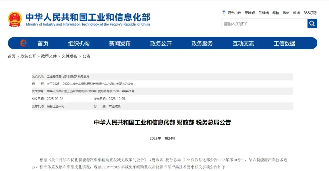 工业和信息化部、财政部、税务总局等三部门近日联合公告2026—2027年减免车辆购置税新能源汽车产品技术要求,明确纯电动乘用车、插电式(含增程式)混合动力乘用车有关技术要求调整等情况。2026年1月1日起,列入《减免车辆购置税的新能源汽车车型目录》的车型,需符合本公告要求。2026年1月1日(含)起,在2026年及以后生效的《减免税目录》发布后,购置列入《减免税目录》的新能源汽车,可按规定享受车辆购置税减免政策。 关于2026—2027年减免车辆购置税新能源汽车产品技术要求的公告 2025年第24号 根据《关于延续和优化新能源汽车车辆购置税减免政策的公告》(财政部税务总局工业和信息化部公告2023年第10号),结合新能源汽车技术进步、标准体系发展和车型变化情况,现就2026—2027年减免车辆购置税新能源汽车产品技术要求有关事项公告如下: 一、纯电动乘用车有关技术要求调整如下:纯电动乘用车百公里电能消耗量应不高于《电动汽车能量消耗量限值第1部分:乘用车》(GB 36980.1—2025)对应车型的电能消耗量限值。最大设计总质量超过3500kg的乘用车电能消耗量限值要求,参照GB 36980.1—2025中最大设计总质量为3500kg乘用车电能消耗量限值执行。 二、插电式(含增程式)混合动力乘用车有关技术要求调整如下: (一)插电式(含增程式)混合动力乘用车纯电动续驶里程应满足有条件的等效全电里程不低于100公里。 (二)插电式(含增程式)混合动力乘用车电量保持模式试验的燃料消耗量(不含电能转化的燃料消耗量)与《乘用车燃料消耗量限值》(GB 19578—2024)中对应车型的燃料消耗量限值相比:整备质量为2510kg以下的乘用车,应小于70%;整备质量为2510kg及以上的乘用车,应小于75%;最大设计总质量超过3500kg的乘用车燃料消耗量限值要求,参照GB 19578—2024中最大设计总质量为3500kg乘用车燃料消耗量限值执行。非汽柴油插电式(含增程式)混合动力乘用车燃料消耗量不作要求。 (三)插电式(含增程式)混合动力乘用车电量消耗模式试验的电能消耗量与《电动汽车能量消耗量限值第1部分:乘用车》(GB 36980.1—2025)中对应车型的电能消耗量限值相比:整备质量为2510kg以下的乘用车,应小于140%;整备质量为2510kg及以上的乘用车,应小于145%;最大设计总质量超过3500kg的乘用车电能消耗量限值要求,参照GB 36980.1—2025中最大设计总质量为3500kg乘用车电能消耗量限值执行。 三、其他技术要求继续按照《关于调整减免车辆购置税新能源汽车产品技术要求的公告》(工业和信息化部财政部税务总局公告2023年第32号)规定执行。 四、2026年1月1日起,列入《减免车辆购置税的新能源汽车车型目录》(以下简称《减免税目录》)的车型,需符合本公告要求;2025年12月31日前已列入《减免税目录》且符合本公告技术要求的车型,自动转入2026年第1期《减免税目录》,不符合要求的车型将从《减免税目录》中撤销。不符合本公告要求、拟列入2026年第1期《减免税目录》的车型,应在2025年12月12日之前完成申报。被撤销的车型,可重新申请列入《减免税目录》。 五、2026年1月1日(含)起,在2026年及以后生效的《减免税目录》发布后,购置列入《减免税目录》的新能源汽车,可按规定享受车辆购置税减免政策。税务机关依据《减免税目录》、减免税标识以及办理车辆购置税纳税申报所需要提供的其他资料,办理车辆购置税减税手续。 特此公告。 工业和信息化部 财政部 税务总局 2025年9月22日