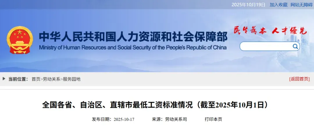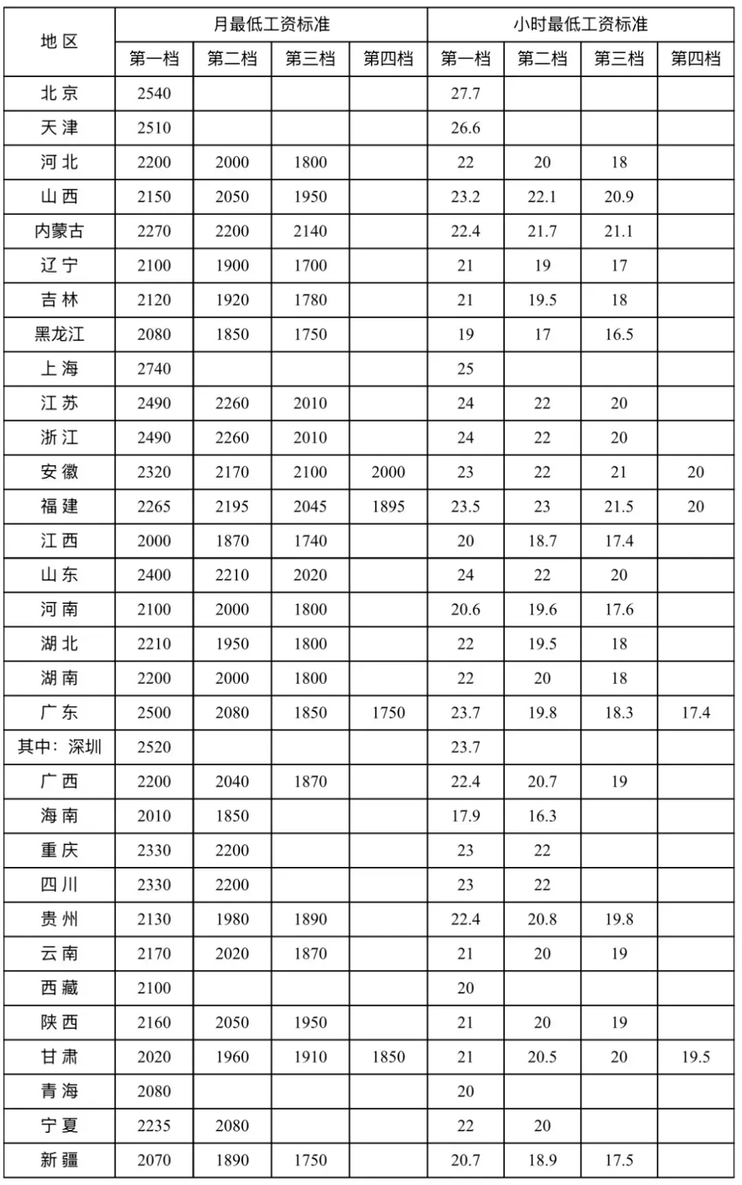 10月17日,人社部官网公布全国各省、自治区、直辖市最低工资标准情况(截至2025年10月1日)。 什么是最低工资标准? 最低工资标准,是指劳动者在法定工作时间或依法签订的劳动合同约定的工作时间内提供了正常劳动的前提下,用人单位依法应支付的最低劳动报酬。所称正常劳动,是指劳动者按依法签订的劳动合同约定,在法定工作时间或劳动合同约定的工作时间内从事的劳动。劳动者依法享受带薪年休假、探亲假、婚丧假、生育(产)假、节育手术假等国家规定的假期间,以及法定工作时间内依法参加社会活动期间,视为提供了正常劳动。 目前,最低工资标准档位最多为四档。数据显示,从月最低工资标准看,上海以2740元的标准居全国首位;从小时最低工资标准看,北京以27.7元的标准为全国最高。 其中,福建第一档月最低工资标准为2265元,第一档小时最低工资标准为23.5元。 全国各省、自治区、直辖市 最低工资标准情况 单位:元 注:本表数据时间截至2025年10月1日。