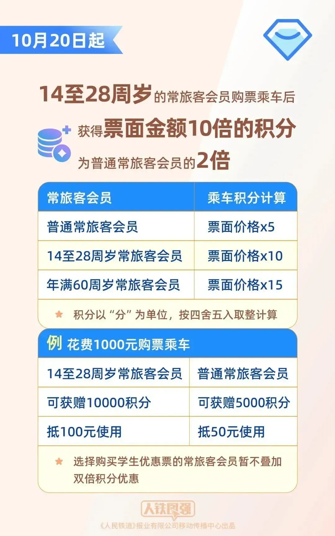 火车票可以“0元购”?很多人都坐过火车,但很多人不知道的是,坐火车还能领取积分,积分可以当钱花。 20日起,中国国家铁路集团有限公司将优化升级“铁路畅行”常旅客会员服务,对14至28周岁持居民身份证、港澳台居民居住证、港澳居民来往内地通行证、台湾居民来往大陆通行证、外国人永久居留身份证的常旅客会员实施更大幅度的积分优惠。 会员积分在兑换火车票的基础上,新增座位升席功能,常旅客会员积分的应用场景进一步拓展。 14至28周岁的常旅客会员 购票后获票面金额10倍的积分 目前,普通常旅客会员购票乘车后可获得票面金额5倍的积分,年满60周岁的老年常旅客会员可获得票面金额15倍的积分,为普通常旅客会员的三倍。 20日起,14至28周岁的常旅客会员购票乘车后将获得票面金额10倍的积分,为普通常旅客会员的两倍,即: 普通常旅客会员花费1000元购票乘车,可获赠5000积分、抵50元使用; 14至28周岁的常旅客会员花费1000元购票乘车可获赠10000积分、抵100元使用。 不过需要注意的是,选择购买学生优惠票的常旅客会员暂不叠加双倍积分优惠。 20日起,会员积分 新增列车座位升席功能 目前,常旅客会员积分可为本人或指定受让人兑换火车票,兑换火车票时100积分可抵1元使用,兑换的车票可办理1次改签并扣减部分积分作为改签费,不办理退票、变更到站业务。 20日起,常旅客会员积分应用场景将新增列车座位升席功能,会员本人可使用积分在列车上兑换办理原车票未乘区间内的任意区间座位的升席。 乘车途中,会员可扫描座椅扶手上的“铁路畅行”二维码登记升席需求,也可直接联系列车工作人员办理。 使用会员积分升席后的新车票不能办理退票、改签业务,因不可抗力或铁路责任造成升席车票不能使用时,可办理退票,升席车票未乘区间的积分将返回会员账户。 优化升级后的“铁路畅行”常旅客会员服务相关规则可通过铁路12306网站、客户端和12306客服热线查询。