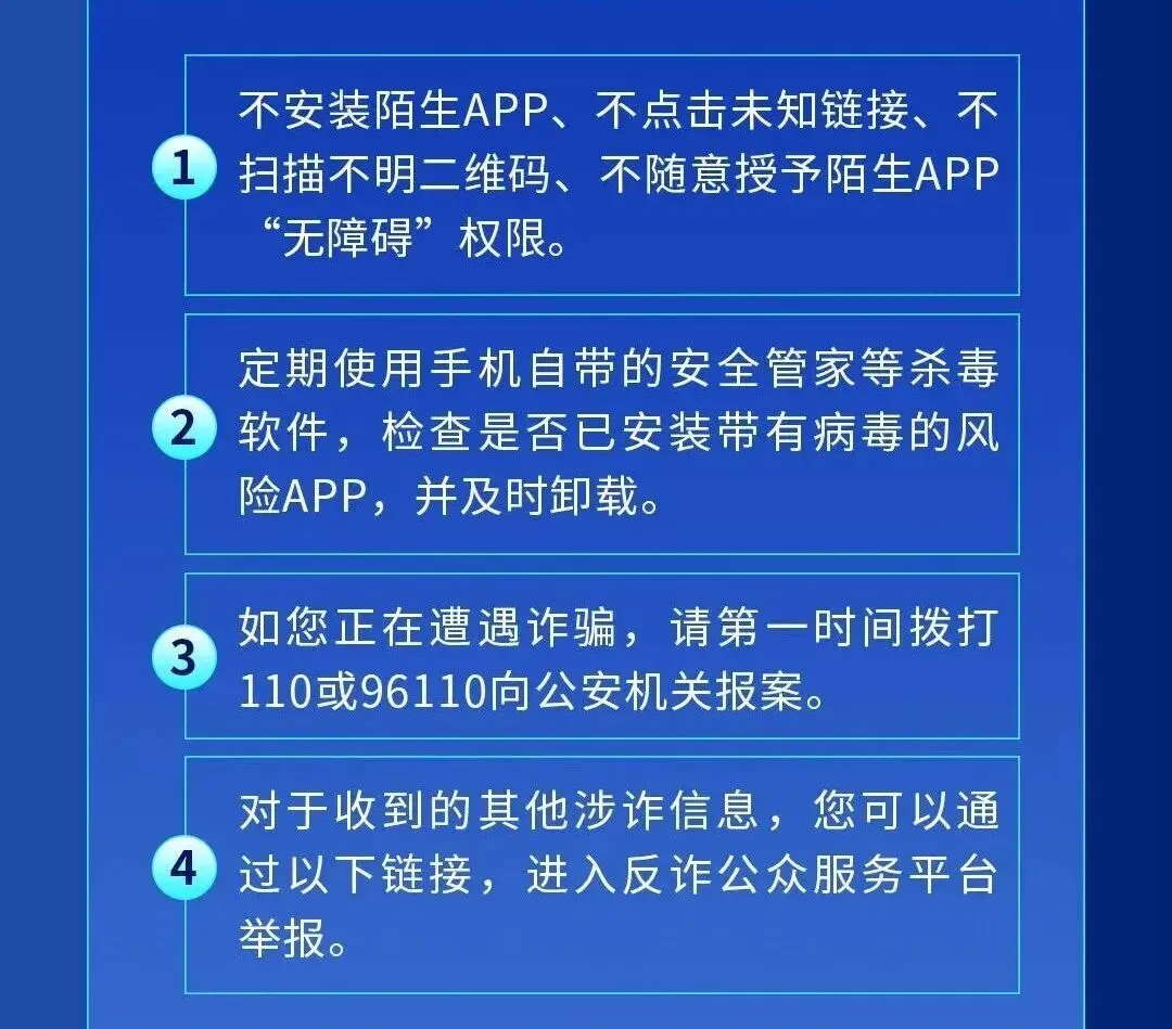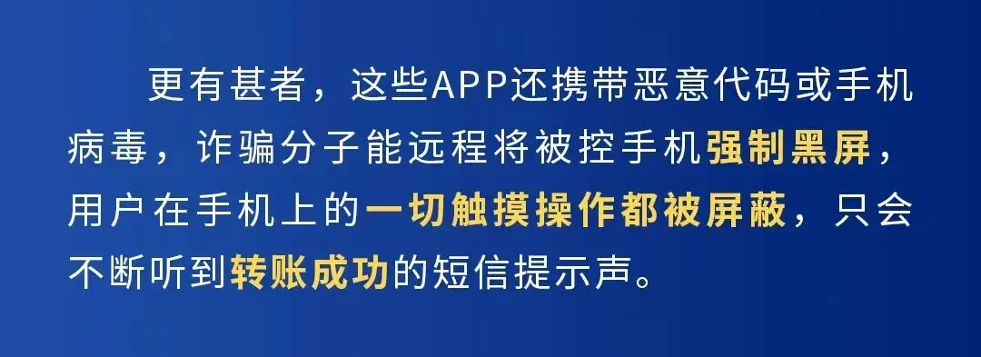 如今 刷短视频、看直播、购物…… 已经成为许多人日常生活中 不可或缺的娱乐方式 但诈骗分子也悄悄盯上了这个“商机” 不法分子冒充短视频平台客服 精心设计各种话术实施诈骗 一些缺乏防范意识的用户 很容易落入圈套 收到短信,49万元不翼而飞 10月份,余先生收到一条快递取件短信,然而,他去取件时却找不到包裹,于是拨打短信中预留电话询问。电话接通后,对方自称抖音客服,说余先生开通了抖音月付功能,如果不关闭,每月需扣费800元。余先生要求关闭服务,在对方的指导下下载了一款App后,手机突然陷入黑屏。无论怎样点击屏幕,都无法进行任何操作,也不能强制关机。等手机恢复后,余先生才发现银行卡里的49万元全部被转走了。 接到电话,9万元被转走 近日,郑女士接到一个陌生电话,对方自称“拼多多”客服,说之前赠送郑女士的“百万保障服务”已经到期,后续将要收费,问其是否要取消。郑女士表示要取消,对方指导其下载一款指定App,要求其开启屏幕共享,引导她逐个银行账户“解绑”该保障服务。随后,郑女士手机黑屏,虽然察觉不对劲,但是却无法操控手机。待手机恢复正常后,郑女士发现手机银行中9万元被全部转走。 手机黑屏,三年定期24万元被转空 近日,张女士接到一个电话,对方自称抖音客服,说她开通了抖音直播,免费期一年,到期了需要支付1000元/年,还让张女士到抖音里搜索到了自己的“合同”。张女士马上表示要取消,对方引导其下载一款叫“抖音服务助手”的App,然后让其先关闭免密支付(目的是偷看密码)。客服说取消过程中会黑屏1到2分钟,要张女士配合人脸验证。等手机恢复正常,“抖音服务助手”App不见了,张女士还没意识到被骗。直到接到反诈中心电话,张女士查看手机,才发现手机银行中的24万元全部被转走。 手机被远程控制 该如何处理? 1、强制重启手机:长按电源键10秒以上(不同机型方法不同),切断远程控制。 2、断网拔卡:若无法重启,马上拔出手机卡,阻断与骗子的连接。 3、报警并保留证据:保留通话记录、短信、App等信息,第一时间报警! 温馨提示 骗子常冒充短视频、电商等平台客服 以“解决问题”为由 诱导受害人下载远程控制类涉诈App 获取银行交易密码、验证码 进而转移资金 广大群众,特别是老年人 一定要提高警惕 谨防上当受骗 如遇可疑情况请及时报警