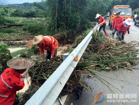 8月13日下午特大暴雨导致973县道沿白线道宝庙路段土石、树木竹子等杂物掩盖道路,过往车辆通行受阻。灾情发生后,福鼎市公路管理局积极应对,精心组织抢险队冒雨上路,排险保畅,清除路障,确保了公路安全畅通有序。