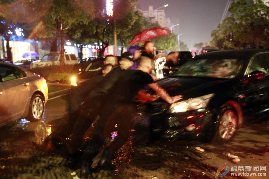 被淹的道路上不时有车熄火,被迫停在路中央,司机都跑出车外了。“熄火了,不敢再发动,前面的车牌都被冲掉了。”王姓司机心有余悸。2个小时过去了,到了晚上7点左右,警车突破路障来到这条支道上,特警们开始疏通道路。一些熄火的车只能用人力推动,特警们上阵用手推车,司机把控方向,一辆又一辆。