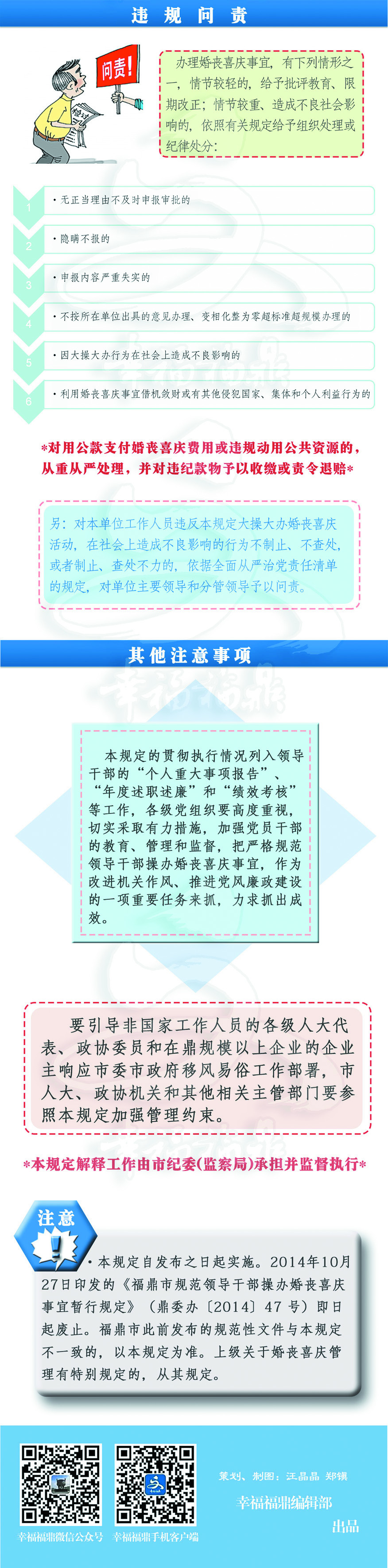 高:福鼎市纪委作为规定的执行监督机关,我们的做法主要有,一是督促有关部门广泛开展宣传,借助媒体向传播向移风易俗的思想,树立新风气;二是认真核实,组织人员对上报的《婚丧喜庆事宜报告表》进行审阅;三是强化监督,畅通投诉和举报渠道,动员各界积极参与,形成合力;四是查处有力,一旦发现,坚决曝光,并追究相关领导责任,切实将制度落实到位。