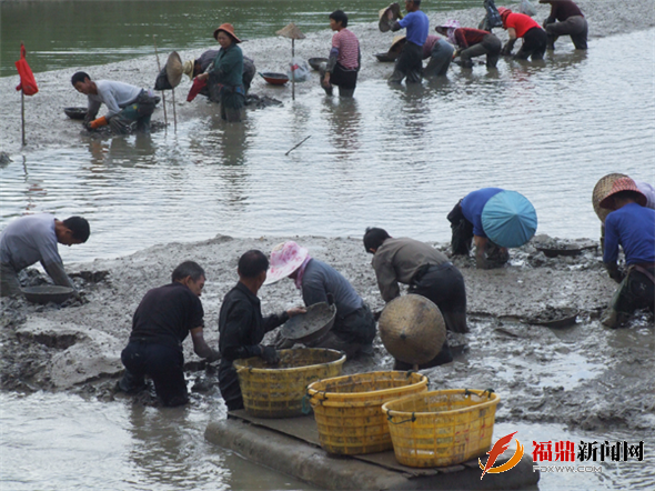 福鼎新闻网讯(朱乃章)当前正是海蛏养殖最肥满上市的最佳时节。近日,福鼎市点头镇龙田村的渔民在垦区养殖滩涂收获海蛏。据悉,由于气温适宜,加上管理得当,今年海蛏比往年的个头要大,市场价比2011年有所上扬,预计今年产量产值比往年皆有所增长。