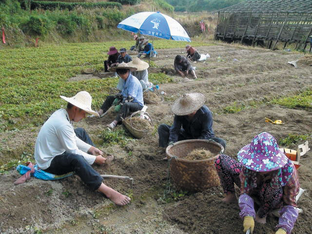 福鼎新闻网讯(兰家喜)目前,正是名贵中药材太子参收获的季节,但售价相比去年下降三成。 6月26日,炎炎夏日笔者走进磻溪镇吴阳村的太子参种植基地。只见工人们正在地里挖掘从去年年底种下去的太子参。这刚收获的太子参不仅色泽金黄,且块根肥大,品质优良。种植户王家义告诉我们,虽然今年是第一年试种,由于管理得好,加上技术人员的指导,太子参长势非常好,亩产干重可达到200多斤。 据了解,目前干货每斤市场价值60元左右,种子每斤50元左右。该镇今年种植面积达3000多亩,目前的市场行情每亩产值1万元多一点,同比去年下降了三成,市场行情不稳定,参农积极性受挫,预计明年太子参种植面积将会受影响。