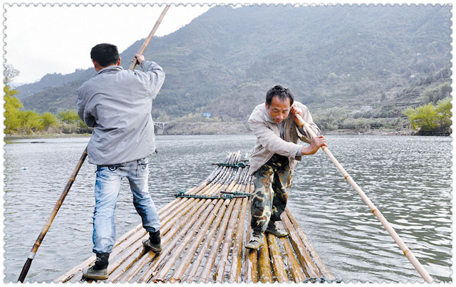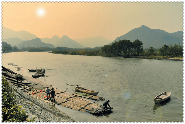 日落时分,三三两两的溪排停泊在霍童榕树下码头。