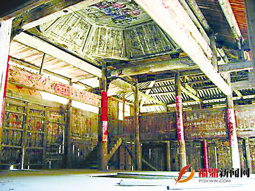 古戏台至今已有430多年历史,整个建筑群占地1500多平方米,由主戏台、观戏楼台、土地宫所组成,中间围成一个天井,光线通透,空间宽敞。主戏台为单檐歇山顶建筑,图案精致,雕工精细,刀法流畅,风格独特。戏台内的正上方是放射状的藻井,戏台内左边是“出将”的上场门,右边是“入相”的下场门,两门上方分别写着“清歌”、“妙舞”等字,左右门正中上置一块明代匾额,上有“裕社咸宁”四字。按民间说法,社戏可以酬谢神灵,祈求神灵保佑,所以,土地宫与主戏台正面相对。