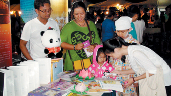 “老师,您怎么也在这里?”拥挤的人群中还时不时出现一阵阵兴奋的声音,“哇,这里有好多节目啊!”曾经在孔院学过中文的学生一个接一个地出现在孔院的中国文化展区前,在他们的朋友面前兴奋地秀起了中文和书法。从没学过汉语的人也禁不住好奇心,在中国老师的指导下,第一次握起毛笔,小心翼翼地写下“水灯节快乐”,激动不已。被围得水泄不通的还有手工体验区,大家竞相学习编中国结和手链,以别样的方式,亲手为朋友送上节日的祝福。同时,露天的“中国电影播放区”轮流放映的《孔子》、《画壁》也为现场增添了许多欢乐的气氛。