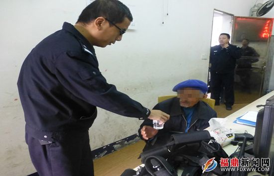 当天中午14时许,桐山派出所接到群众报警称:在辖区的南溪水库有一老人在寒风中瑟瑟发抖,请求民警救助。接警后,值班民警立即出警,因为南溪水库位于山区,道路遥远,民警驱车一个多小时才到达现场。到达南溪水库后,民警发现一名老人躺在水库大坝上,神情紧张,全身发抖。民警马上将老人请上车,并询问老人情况,老人当时无法回答。于是,民警将老人带到所里,为老人倒上热开水,并买来热汤面给老人充饥。经过民警的悉心照顾,老人精神好了许多,在长时间的询问后,民警得知老人叫许国庭,78岁,四川人。随后,民警通过信息查询了解到老人家住四川省荣县,因今年3月初从老家出来到福州以乞讨为生,前一段时间从福州一路走到福鼎。当天因路况不熟,体力透支才倒在了南溪水库。最后,民警自掏腰包给了老人一些救济金并将其送至福鼎市救助站。