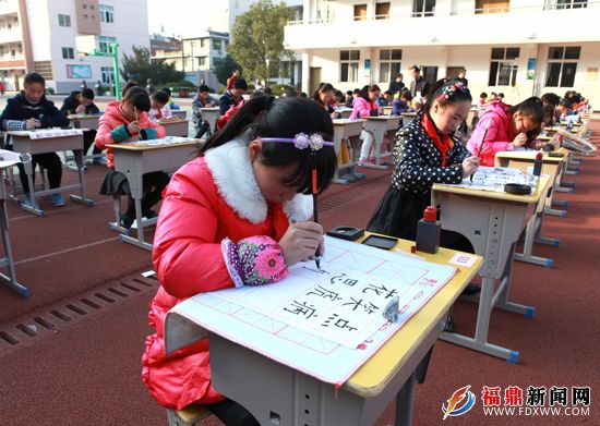 本报讯(王代奎)12月25日,福鼎市太姥山镇中心小学“写规范字 做文明人”百人现场书法大赛在学校的文昌阁前举行。来自全校各个班级的200多位学生参加了比赛。书写工具和内容按低、中、高三个年段划分,分别用铅笔、钢笔、毛笔来书写,以各年级课标所要求掌握的字词为内容。通过活动,教育学生工工整整写汉字,堂堂正正学做人。同时激发学生书写汉字的兴趣,培养学生规范书写汉字的习惯和技能,弘扬和传承中华传统文化。