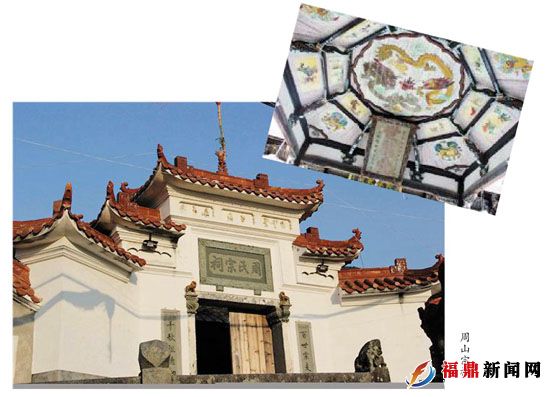 周氏宗祠始建于明万历年间,后扩建于清乾隆年间,是市级文物保护单位。祠堂由120支木柱和精雕的大梁组成,规模宏大,华丽气派。周氏宗祠建筑构件颇有讲究,诸如木雕、石雕、砖雕等,精刻细凿,各自的表现手法因建筑部位的不同而相异,砖雕可见于宗祠门额,石雕多见于柱础、抱鼓石,木雕多见于梁枋、雀替、门板、窗棂,技艺纯熟,悦人心目,令人叹为观止。