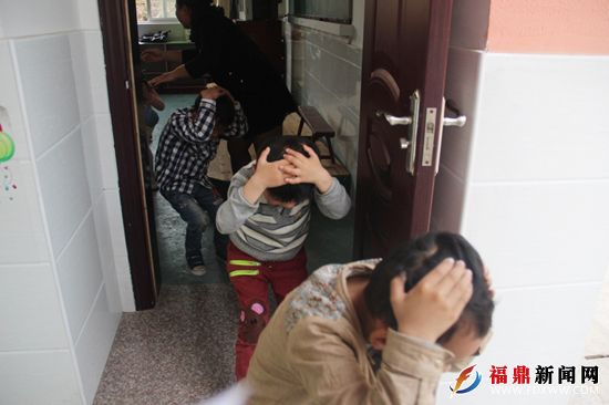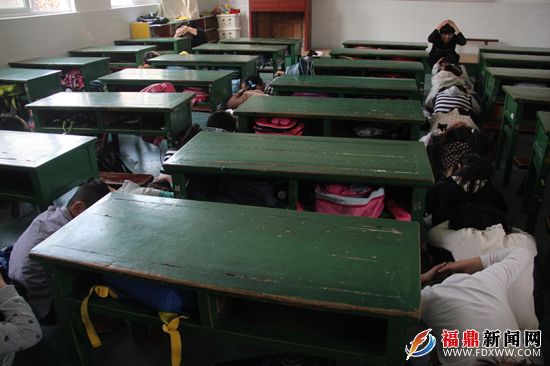演练开始时,在强烈的警报声下,在“注意,地震”的呐喊声中,学生迅速蹲在课桌下,有的用双手护住头部,有的用书包、较厚的书本护住头部。大约2分钟后,在教师 “开始撤离”的号令下,同学们按照演练的步骤和疏散线路快速有序地跑出教室,安全撤离到规定的避灾地点。