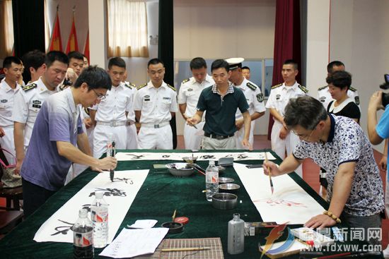 在联谊会后,福鼎市图书馆馆长、著名书法家王新生,市知名书画艺术家陈昌平、夏新峰等,现场为官兵们泼墨挥毫。艺术家们个个精神饱满,精心创作。在将近2个小时中,共奉献50余幅书画艺术作品。一幅幅功力深厚、淡雅别致的绘画,一张张力透纸背、雄浑遒劲,呈现不同艺术风格的书法,赢得了官兵们连声赞誉。