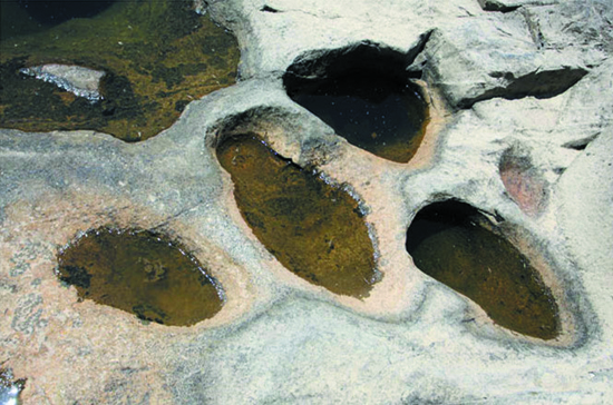 溯溪前进,抵达一片较为平坦的石滩。河床呈波浪,留下数条平行分布的石臼类浅坑、沟槽,呈串珠状断续分布,似耕犁在土地上留下的痕迹,叫做刨痕犁沟。