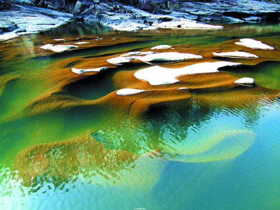 犁沟中浅浅地蓄了一些水,鼓起的石背断断续续露出水面,便有仙人叮埠之类的景致。这些“犁沟”是200万年前冰川运动在石头上刨出的痕迹。