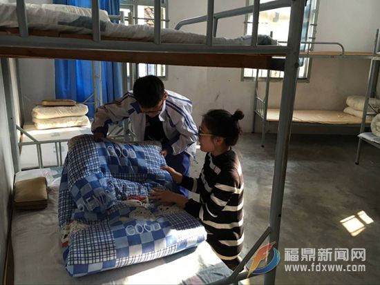 活动中,青年教师来到学生宿舍,教年龄小的学生折被子,为孩子修剪指甲,查看学生箱包衣服是否带齐带够,志愿者还为他们送上文具盒、笔、练习本等学习用品。