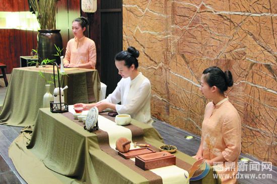 当你的感知正徜徉在《福鼎白茶赋》中的茶史、茶树、茶艺、茶香的茶世界里,旁边早就立着一位妙龄女子,邀请你到左边品茶席上品茗。正应了中国一句古话“客来敬茶”。落座后,当你在观赏着那种精妙的茶艺表演,当你欣赏着那“白毫银针”在杯中初是亭亭欲立,后又曼妙下坠的神奇情景,当你品咂着杏黄色的清香四溢的茶汤,真是从未有过的陶醉。这时,我情不自禁的吟起苏东坡的名句:“从来佳茗似佳人。”过去,对苏轼把佳茗比佳人只停留在《檀几丛书》中“即以茶论,其合乎美人之道者三焉:一欲其颜色之雅淡也;一欲其风味之香浓也;一欲其韵致之轻清也”的理性认知,今天才有了深入的感性认知。难怪有人说:“品茶谈茶,这是文化,也是一种意境。”