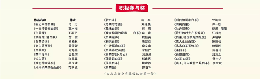在2014年8月至2015年11月初,福建省福鼎市茶业发展领导小组与《中华合作时报·茶周刊》,携手福建品品香茶业有限公司面向全国推出了“品品香”杯白茶心语文学作品大赛。期间,从来稿中共甄选出50篇作为参赛作品,按时间顺序依次刊登在每周二出版的《中华合作时报·茶周刊》第七版文化·健康版(为大赛所开辟的)专栏中。