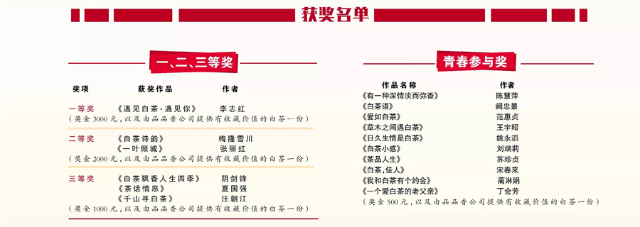 本次大赛特设的“青春参与奖”,入选作者年龄皆在30岁以下,旨在注重表达白茶融入年轻群体的生活,评委们对这一奖项给予高度评价,认为中国茶这一古老的饮品应该让更多的年轻人喜欢、饮用。五位评委逐一提交了的候选获奖作品名单,针对四个奖项展开讨论,最终本着公开、公平、公正的原则,共同推选出16篇获奖作品。