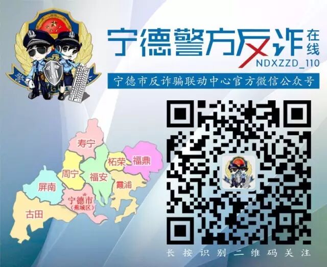 宁德市反诈骗联动中心诚挚邀请您和您身边的人关注我们,我们会及时发布预警提示,解密新型诈骗,宣传防骗技巧,接受咨询举报。24小时受理热线:110!