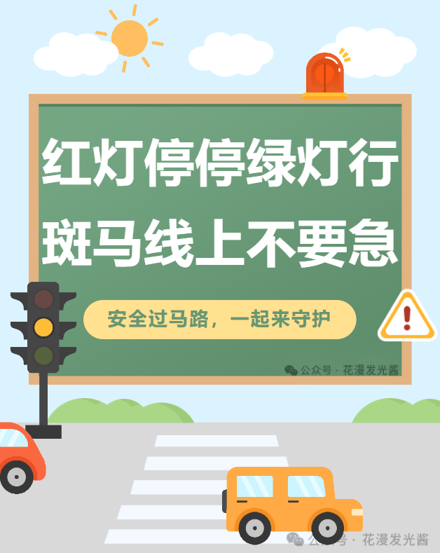 亲爱的家长朋友们: 你是否会发现小朋友在过马路的时候总想挣脱你的手,飞奔过马路,今天我们一起通过玩游戏的方式,让小朋友牢牢掌握过马路的的安全通行秘诀 魔法安全四部曲 通过小游戏的方式来养成安全过马路的好习惯。 01.小树苗站站好 让小朋友站在红绿灯旁边,数五朵小花的时间,并告诉他现在他是小树苗,小树苗要站好,让小朋友养成在红绿灯处停留的习惯。 02.小侦探望远镜: 数完小花后,就让小朋友用小手做望远镜,问他红绿灯现在是什么颜色,并告诉他红灯时”草莓味的禁止符号“,绿灯是“薄荷味通行证”,黄色是”柠檬味的注意符号“培养小朋友过马路前观察红绿灯的习惯 03.长颈鹿脖子舞: 左右转头唱儿歌,”左看看,右瞧瞧,扭扭脖子做早操,汽车宝宝睡觉了,我们轻轻走小道。“通过唱儿歌的方式可以激起小朋友过马路观察的习惯。 情景模拟小剧场 在家里与小朋友一起模拟过马路的情景,让小朋友更好的掌握知识。 道具准备: 红黄绿彩纸,粉笔化斑马线、玩具车,人物小玩偶。 游玩流程: 家长和小朋友饰演不同的角色,一起模拟过马路的小场景,小朋友做好了可以进行一定的奖励,家长也可以故意做错让小朋友来进行纠正。 安全知识儿歌 《过马路安全拍手歌》 主歌一: 红灯亮 草莓糖(双手比叉) 小脚丫 贴地上(跺脚三下) 斑马线 钢琴键 (手指弹空气) 数到十 才歌唱 (晃脑袋数数字) 主歌二: 绿灯跳 薄荷笑(双手举高高) 左看看 右瞄瞄(转头动作) 牵大手 像企鹅(模拟摇摆走) 小汽车 都让道(做司机摆手状) 副歌: 叮叮当 过街谣(摇铃铛动作) 安全规则要记牢(指小脑袋) 斑马线上慢慢走(单脚跳) 我是聪明小宝宝(双手比耶)