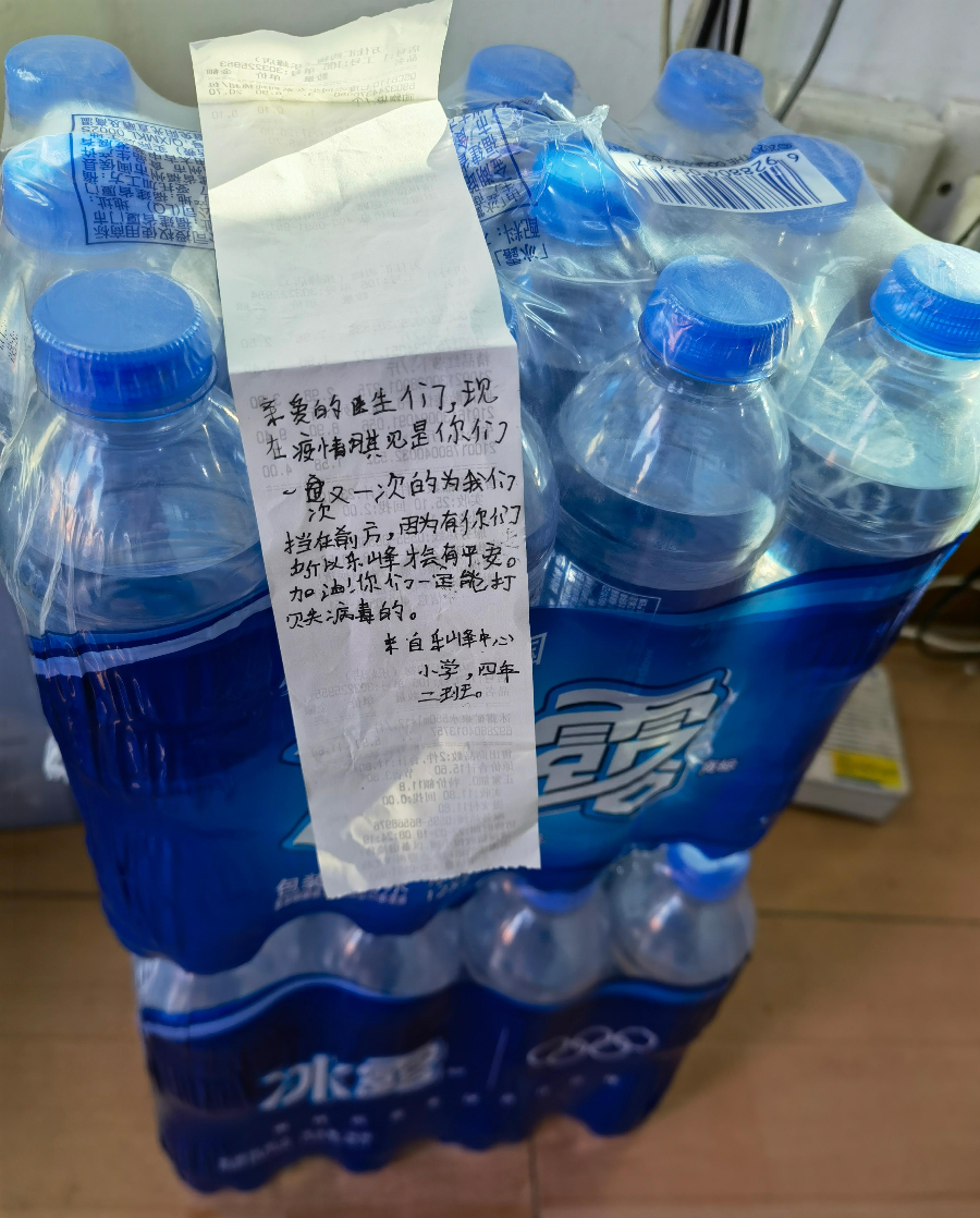 一个不留名的小朋友由妈妈骑着电动车,给南安市乐峰镇炉中村振扬文化中心核酸检测采样点医务人员送来矿泉水。她悄悄放下矿泉水就走了,留了一张落款为“乐峰中心小学四年二班”的字条,字条上写着“亲爱的医生们,现在疫情期间,是你们一次又一次地为我们挡在前方。因为有你们,所以乐峰才会有平安,加油!你们一定能打败病毒的。”虽然,字条里有几个错别字,但医务人员仍然满受感动。