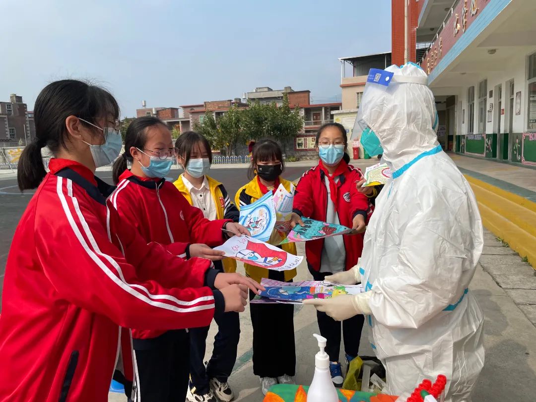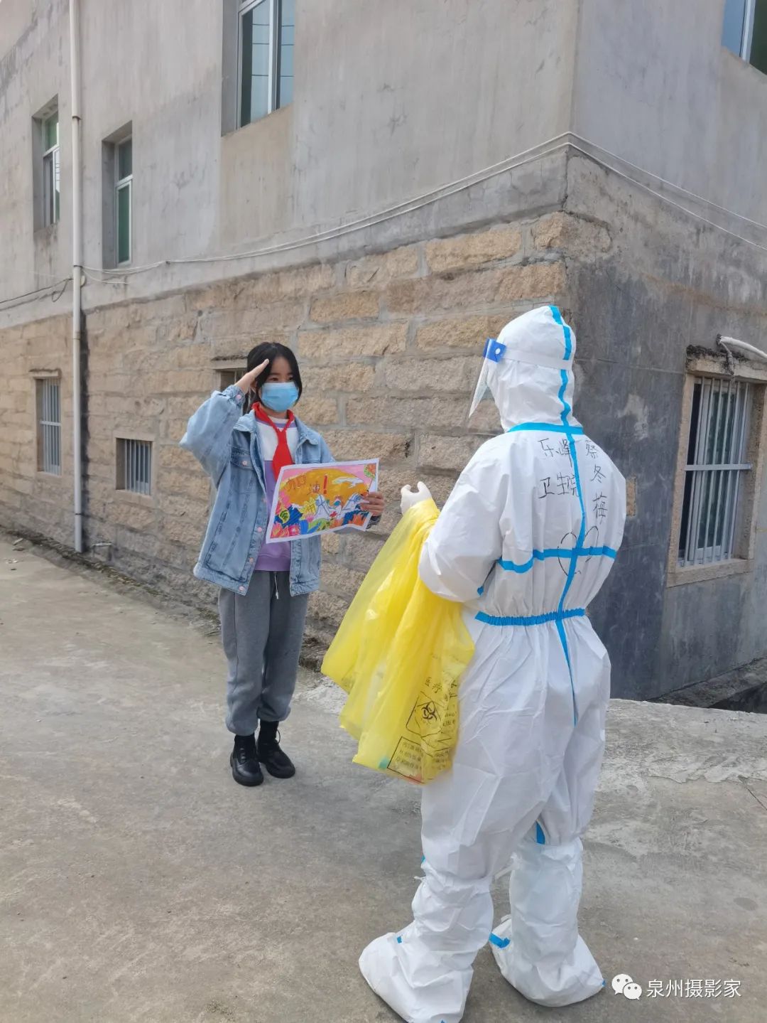 南安市乐峰镇炉星村,乐峰中心小学6年级的黄钰涵小朋友,在采样点做完核酸时看到乐峰卫生院医护人员的辛苦,她回家花40多分钟赶画了一张水彩画,戴上红领巾跑过来送给正在上门入户做核酸的“大白”,并恭恭敬敬地敬了一个礼。画上一群“大白”在鲜花盛开的春天里,奋战抗疫,并写上大大的“加油”两字。