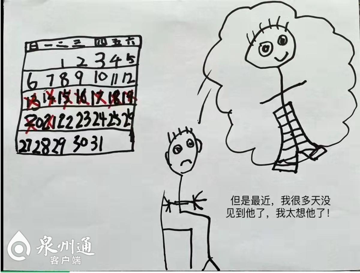 “他没上班的时候,最喜欢陪我玩了。但是最近,我很多天没见到他了,我太想他了。”因为想念爸爸,在家的刘宸浩把这份想念画成一幅幅画。