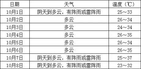 中秋遇上国庆 连休8天的超长假期近在眼前! 你是宅家休息还是出门嗨玩? 要出门的你 一定会关注天气是否影响出行 这份福鼎假期天气预报 请收好 全市天气预报 国庆中秋假期期间 预计天气总体较为平稳 气温偏高 后期沿海海区有大风 天气: 10月1日阴天到多云,有分散性阵雨或雷阵雨;2~6日以多云天气为主;7~8日阴天到多云,部分有阵雨或雷阵雨。具体天气预报如下: 10月1日,阴天到多云,部分有阵雨或雷阵雨,局部中雨。 10月2~6日,多云,局部有阵雨或雷阵雨。 10月7~8日,阴天到多云,有分散性阵雨或雷阵雨。 气温: 平均气温24~28℃,较常年同期偏高2~6℃。1~7日最高气温32~35℃,局部36~37℃。8日受冷空气影响,最高气温28~32℃。 风力: 1~6日无8级以上大风,7~8日有7~8级阵风9级的东北大风。 福鼎气象部门提醒 1.关注高温天气对人体健康和户外活动的不利影响。 2.4~6日全市大部分森林火险气象等级较高,请注意野外用火安全。 3.防范后期海上大风对航运、滨海旅游和渔业等行业的不利影响。 4.假期中后期在西北太平洋洋面和南海海域可能有热带气旋生成,福鼎市气象局将密切跟踪监视,及时发布预报预警。