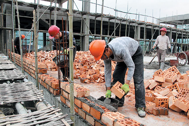福建省广福茶业公司厂房内工人们正在加紧建设厂房围墙。