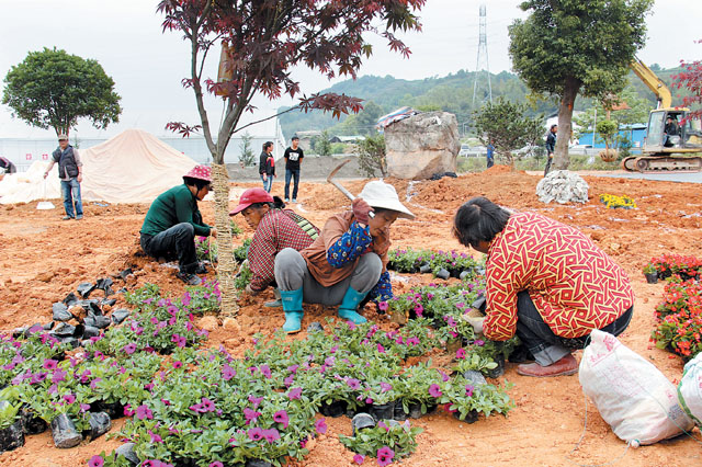 连日来,店下(岚海)千亩高新农业园区内挖机飞舞、斗车穿梭,数十名工人忙着对园区的绿化带、喷泉、路灯抓紧建设。据悉,该园是我市两个高优农业园区之一,位于店下镇西北部,是店下岚亥万亩现代农业设施创业园“一园三区”的首个建设创业示范区,规划占地面积1000亩,总投资5500万元。截止日前,已投入1000万元完成园区规划设计、招商引资、500亩土地流转、230亩钢架大棚搭建、研发中心、停车场、350米机耕路水泥硬化、500米港道清於、1000米灌溉渠道新建等一期工程建设。 图为工人们正在店下千亩高新农业园内栽花、绿化。 周元和 摄