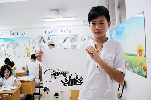 听完老师的技巧,海外华裔青少年跃跃欲试,拿起毛笔,纷纷动手作画。虽然他们以前从未接触过水墨丹青,但仍一板一眼,毫不马虎。不消得几刻钟,各种鱼、虾、螃蟹跃然纸上,栩栩如生。其中营员金豪的作品最受同学们的追捧,金豪告诉记者,他从来没有学过国画,但他很喜欢,还想多学一些中国画。