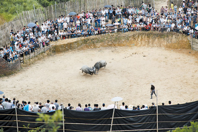 7月20日,管阳镇沈青村山坳的斗牛场里呼声阵阵,热闹非凡,这里正举行着中国式传统斗牛比赛。这种独具特色的民间竞技表演活动吸引了四面八方的游客前来观赏。 管阳镇沈青村与浙江省泰顺县柳峰乡毗邻,村里斗牛有着近百年的历史,当地群众选择在春耕后和秋季丰收之季举办斗牛节,尤以农历六月最为隆重。斗牛比赛开始时,两牛怒目相对,上前就斗,时而以角相抵,寸步不让,时而扬蹄冲撞,强攻顽战,或顶挂,或架靠,或抽撞,场上尘土飞扬,险象环生。其角斗之惊险、形式之有趣,让观众大开眼界。 吴维泉 摄