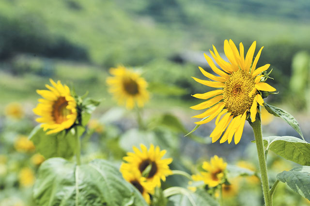 本报讯(蔡丽军 王悦)连日来,店下镇巽城村5万多株向日葵花开争艳,在阳光照耀下显得格外鲜艳夺目。 连片的金色向日葵竞相怒放,昂首挺胸,大如圆盘,小似菊花,在风中摇曳。与碧蓝的天空、飘浮的白云、青翠的群山,构成一幅美丽的风景画,吸引着众多游人观赏。游人穿梭其中,纷纷拿起相机记录下这美丽的瞬间。 据了解,此片向日葵园占地30多亩,每天上午7:00至9:00,下午4:00至6:00是最佳看花时间,为了延长观赏期限,葵花园内的向日葵分片错时种植,盛花期将持续到8月底。
