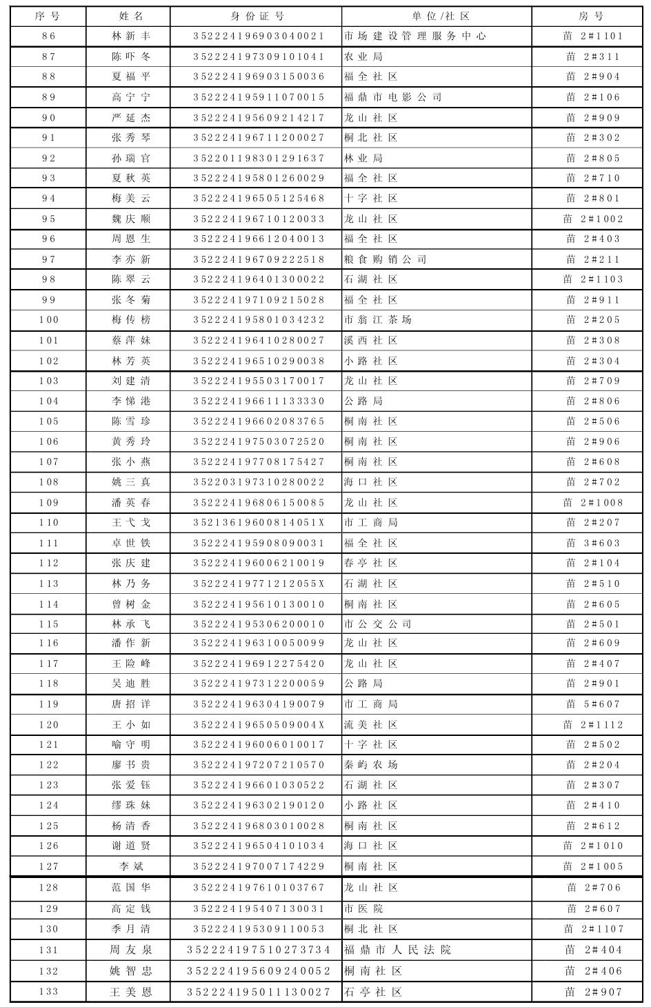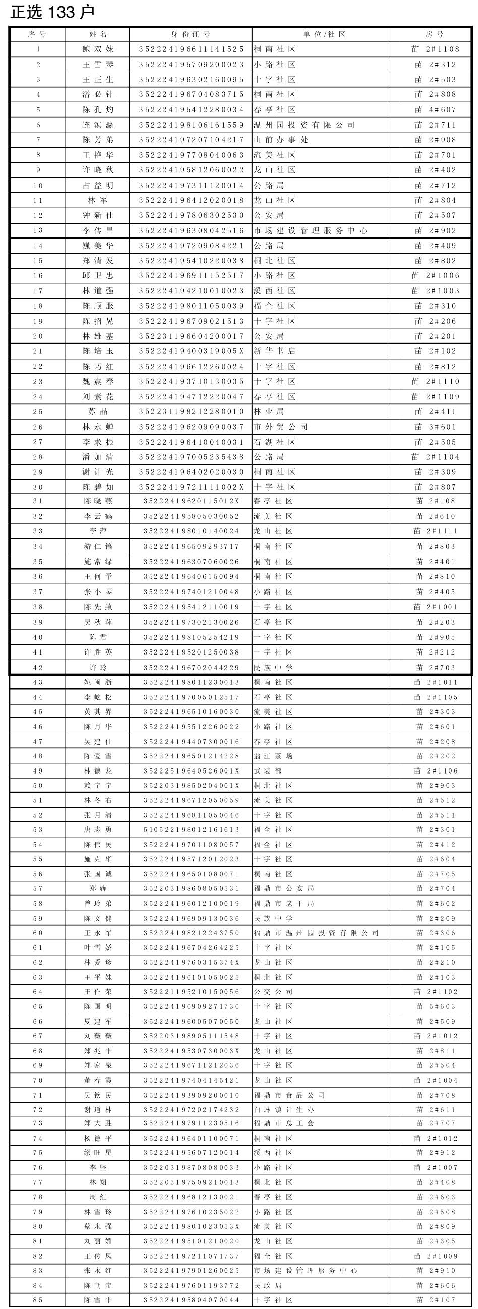 根据《福鼎市经济适用住房销售方案的通知》鼎政综[2009]71号和《福鼎市保障性住房管理暂行规定》鼎政综[2012]20号文件的精神,于2013年7月26日下午在市政府2号楼6楼会议进行福鼎市经济适用房第三批电脑公开摇号,产生正选对象133户,备选对象32户。现将摇号结果公示,欢迎社会监督。