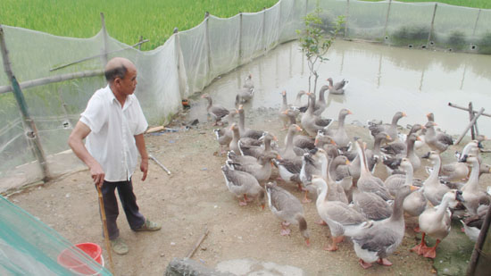 今年64岁的余俊连老伯告诉笔者,以前他曾在部队服兵役,退伍后一直在外打工,1999年因患脑溢血,基本丧失了劳动力。回到老家后,只能做点轻巧的农活,生活十分艰难。这之前,他还养了多年的鸡鸭等家禽,但市场信息不灵,加上他行动不便,到2008年养殖家禽不但没赚竟然还略有亏损,弄得求借无门,连生活都陷入了困境。2008年,当余俊连第一次看到有着“肥肝之王”之称的法国朗德鹅,他就决定了在自家房旁闲置的田地试养这种“洋鹅”,在市残联、信用社的资金支持下,他辟出1亩多地,盖鹅舍、挖湖面,第一批购进50只鹅苗,利用当地环境资源,实行半放养生态养殖模式。