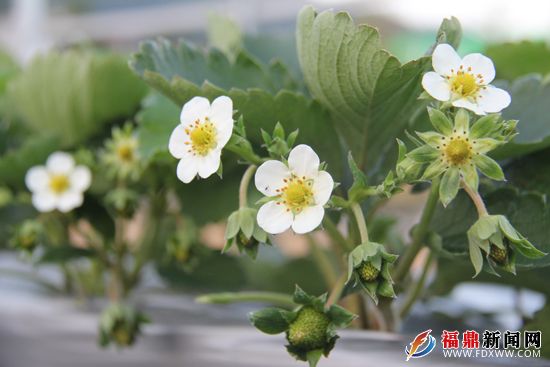 福鼎新闻网讯(周元和)31日上午,记者在园区内看到,大棚里大片草莓枝叶翠绿,叶间露出朵朵洁白的草莓花朵,迎着初冬嗖嗖寒风竞相绽放,花蕊旁还挂上许许多多的小果实。据悉,这片牛奶草莓是入驻店下千亩高优农业园的福鼎恒润农业发展公司种植的,今年首期种植30多亩,经过前期的悉心管理、栽培,草莓现在已陆续开花绽放、结果。福鼎恒润农业发展公司董事长汪爱军说:“我们今年的草莓刚种下去,不是非常好,不过最近一个月来,草莓长势喜人。”她告诉记者:“因为最近的天气晴好、气候适宜,比较有利草莓的生长,加上工人、农民和管理人员在精心管理、照料,所以原本要推迟半个月开花的草莓比往日提前十多天。”