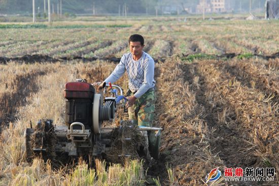 图为:店下镇东岐村种植户邓友良正在犁田作垄。