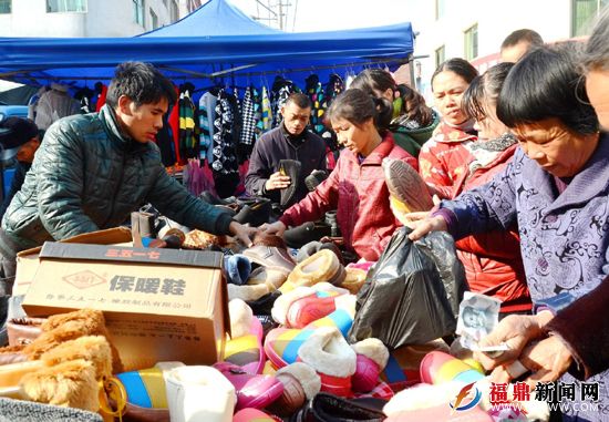 与董俊仗一样,来自泰顺的小徐专门从东北收购70、80斤类似豆腐皮的花生植物蛋白,摆摊销售。而来自安徽的李大姐则每年都会花上一段时间往返于泰顺、福鼎,销售各类年货。“每年都会来这里参加圩市开市,一天能赚几百元。”李大姐笑嘻嘻地说。