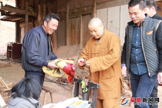 1月20日,福鼎市东兴寺住持释戒慧法师代表福鼎佛教协会与当地的佛协志愿者们一起带着浓浓的关怀之情,捎着新春的祝福和问候,深入点头镇观洋村、大坪村走访了10户困难家庭,为他们送去了年货和慰问金。