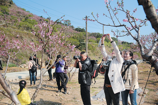“周末乘着天气好,就过来看桃花了。”一名浙江籍的游客说道。3月26日,来自苍南县的数名游客携带照相机开心地拍摄起照片。