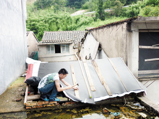 沙埕镇党委书记等领导在一次下基层走访得知郑敬群的情况后,立即督促该镇有关部门安排资金1000元,后岙村两委筹资500元,加上当地爱心人士郑祖禄捐资500多元,为郑敬群重修房子的大门和屋顶。如今,郑敬群可以再次住上自己的“安全小屋”了!(图为木工在修葺屋顶)