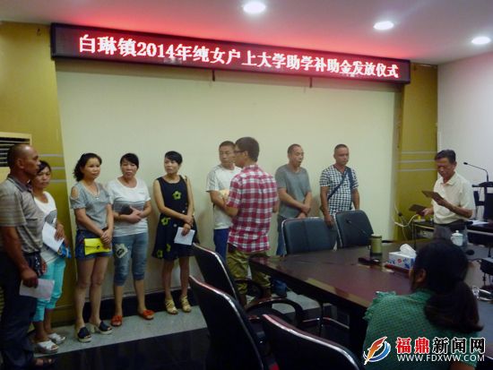 9月1日,白琳镇计生办举行“2014年纯女户上大学助学补助金”发放仪式。各村(居)部分独女户、二女结扎户等受助对象共计44人参加发放仪式。