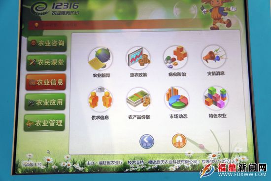 据了解,12316农业服务热线是福建新农村综合信息服务项目的一个重要组成部分,实现全省农业信息共享,主要为农民提供各类农业咨询服务。其功能包括农业咨询、农民课堂、农业信息、农业应用、农业管理平台等。终端机安装后,当地农户将可免费咨询各项支农惠农政策和生产生活中遇到的各种问题,可根据自己的需要,通过“专家库”寻找相关领域的专家,通过视频向专家咨询。
