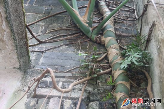 据房屋主人石老太太说,这株龟背竹的树龄已有一二十个年头,当时她儿子也是随意栽植在墙脚下并没有太在意,它就顺着墙壁向上生长,它生长的速度很快,去年这个时候才到达二层楼多一点,今年就到达三层的窗台了,而且根系特别发达,有的气生根还透过墙壁的砖头的缝隙伸长到房间里来,这让她始料未及。
