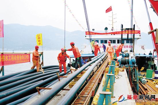 消除危机,刻不容缓,重筑水线,势在必行。今年2月,在市委、市政府的高度重视和各部门的通力协作下,沙埕镇党委、政府集思广益,立即研究制定了一份“应急供水海底管道改造工程”,并将其作为沙埕镇2014年的“一号工程”来抓,项目计划新建一条跨海海底管道,与“原沙埕镇跨海引水工程”岸上管道相连,建成后,日供水能力可达2500吨,充分满足沙埕镇群众用水要求。该工程总投资738.61万元,管道总长1930米,其中海底管道1720米,采用目前国内先进的钢丝网骨架塑料(聚乙烯)复合管,耐腐蚀且环保,该工程预计年底可竣工。据悉,为保证群众可以尽快并彻底解决用水难问题,工程施工方实行24小时轮班制,加快工程进度,以确保明年元旦前能实现为沙埕集镇5个村居1万多人的提供充足水源,改善人民群众生活、生产及当地驻军的生活条件。