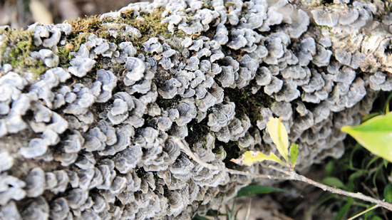 随后,笔者上网查询比对得知,这种菌类叫云芝,别名:千层蘑,又称彩云革盖菌或瓦菌,是多孔菌科植物云芝的子实体或菌丝体,具有一定药用价值。